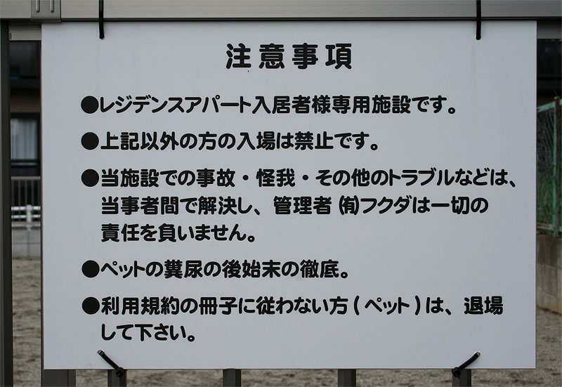 当施設での事故・怪我・その他トラブルなどは、当事者間で解決し、管理者(有)フクダは一切の責任を負いません。